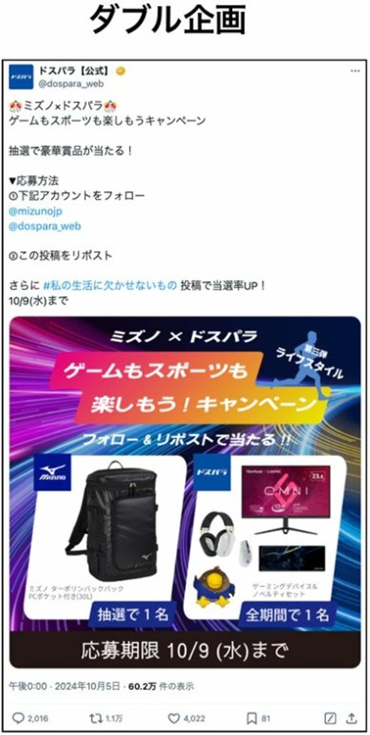投稿では、ミズノのバックパックやドスパラ提供のゲーミングモニターなど、豪華な賞品を目玉としてアピール。背景にはスポーツとゲームを象徴するダイナミックなデザインを採用し、視覚的なインパクトを強調しています。