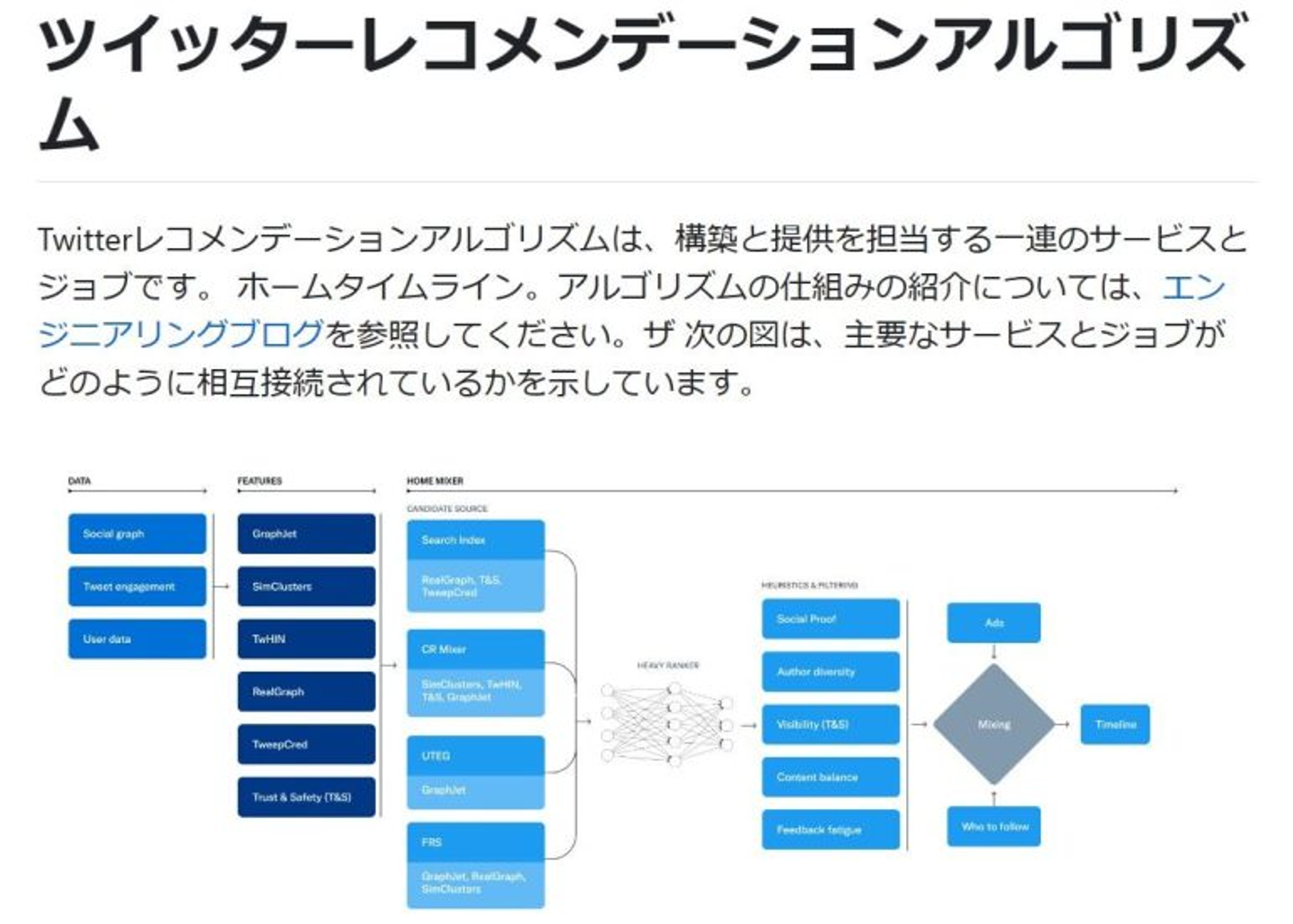 Githubでは、下記図のTwitterレコメンデーションアルゴリズム(構築と提供を担当する一連のサービスとジョブ)や、推奨アルゴリズムの主なコンポーネント(構成要素)について発表しています。