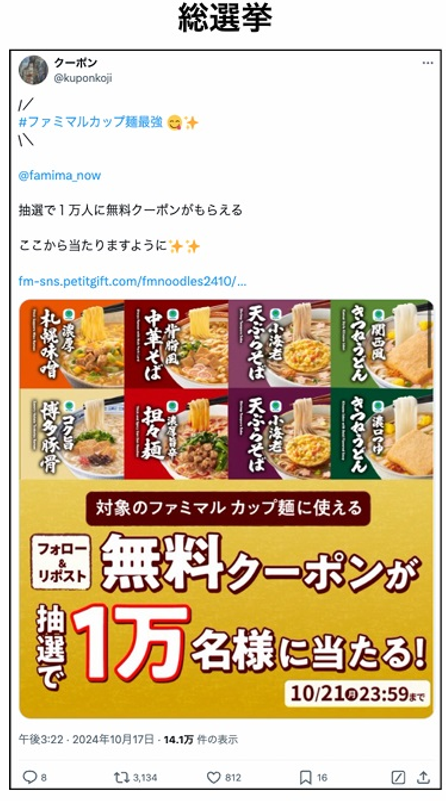 投稿では、商品の画像を中心に配置し、対象となるカップ麺の種類が一目でわかる構成に。さらに、「無料クーポンが1万人に当たる!」という特典を大きくアピールし、視覚的なインパクトで強く印象に残る仕上がりになっています。
