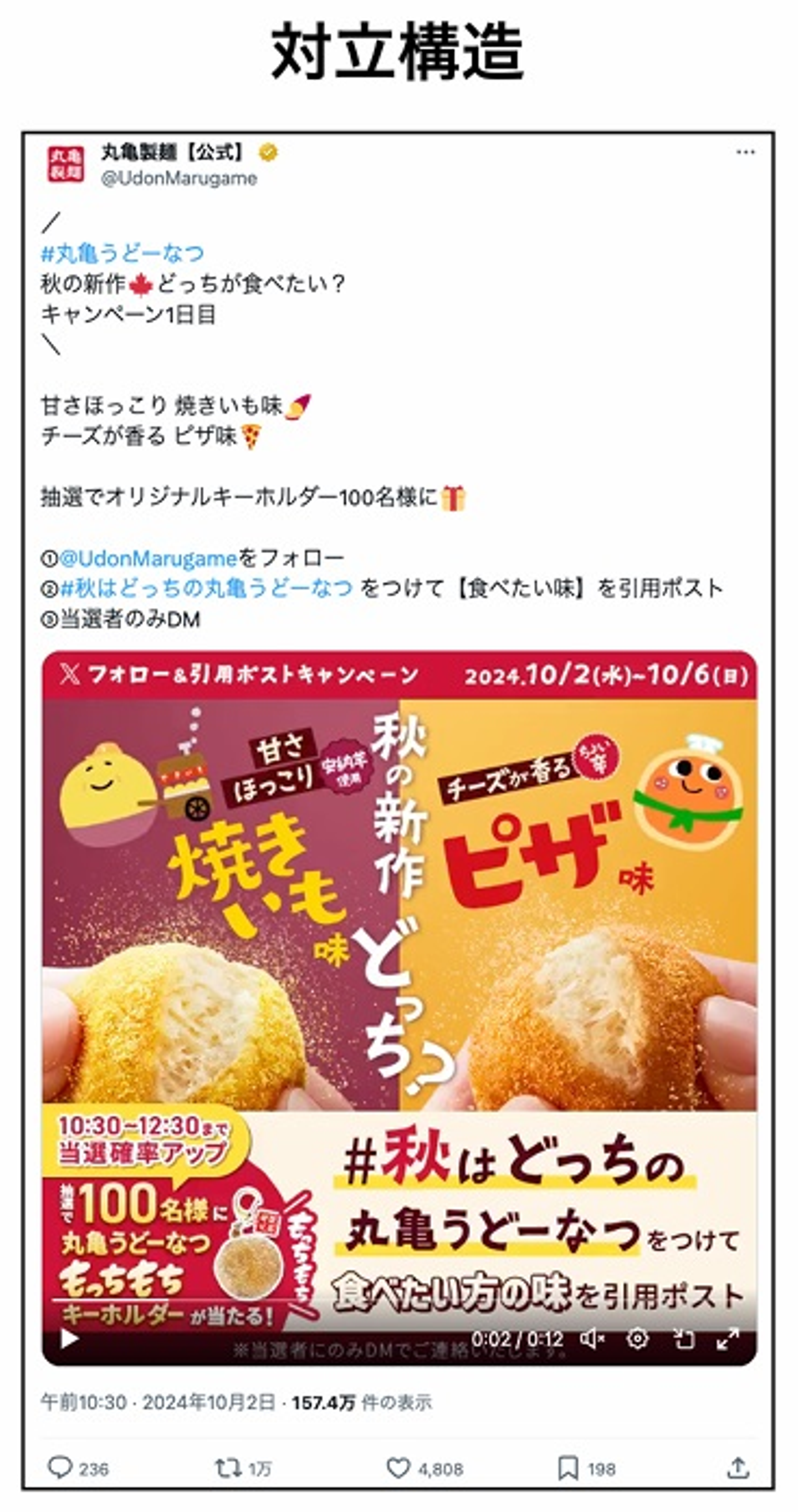 たとえば、丸亀製麺の投稿では、話題のうどーなつを「焼きいも味」と「ピザ味」という対照的な商品の特徴を打ち出しています。背景色やアイコンのデザインも、それぞれの商品イメージに合った色や形状を採用することで、視覚的に対立構造を強調させます。