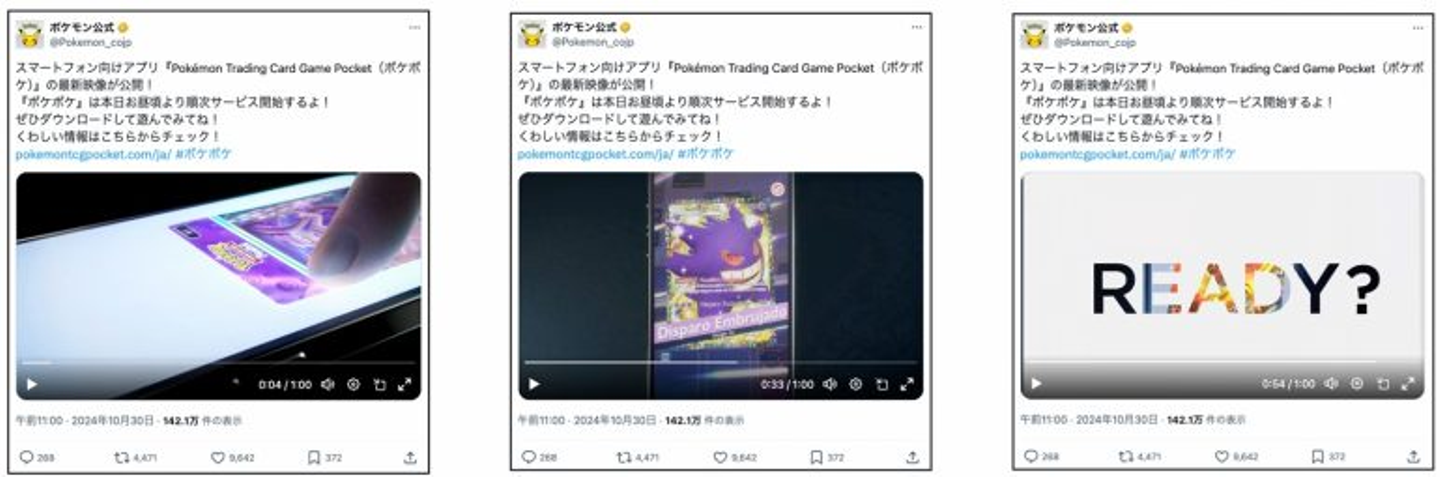 ティザー施策とは、情報を小出しにしてユーザーの期待感を高めるマーケティング手法で、「リリース前」の告知に効果的です。ポケモン公式アカウントでは、新アプリ「Pokémon Trading Card Game Pocket(ポケポケ)」のリリースに向け、短い動画や「READY?」といったキャッチフレーズで次の展開を期待させています。