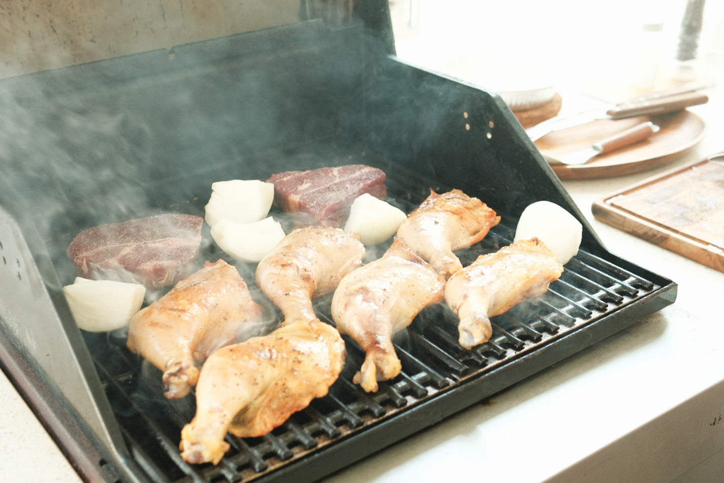 そしてお待ちかねのBBQタイムです。据付の立派なBBQコンロでチキンや牛肉を焼きはじめます。