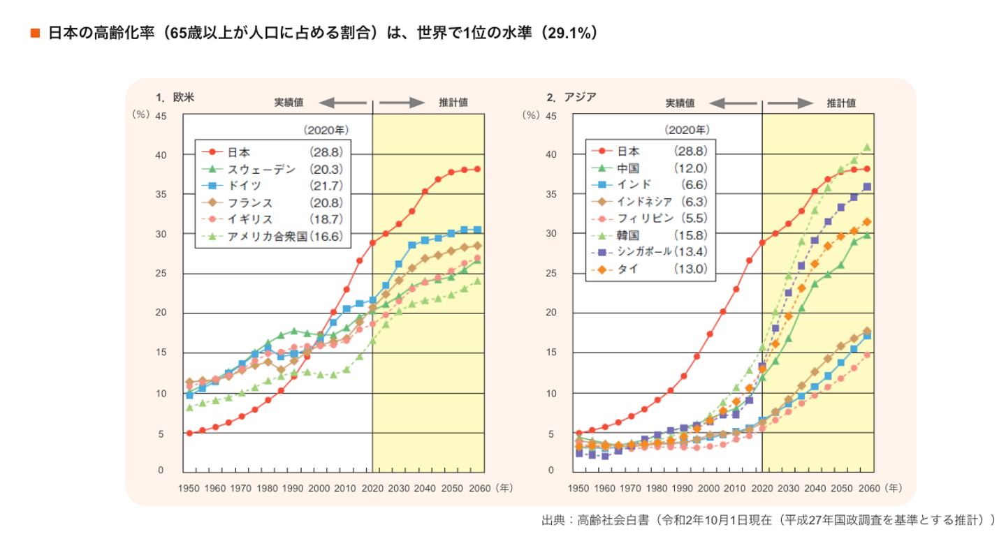中でも日本は世界で最も高齢化が進んでいる国であり、既に「超高齢社会」※というフェーズに入っています。(※超高齢社会:高齢化率(65歳以上が人口に占める割合)が21%を超えた社会のこと)