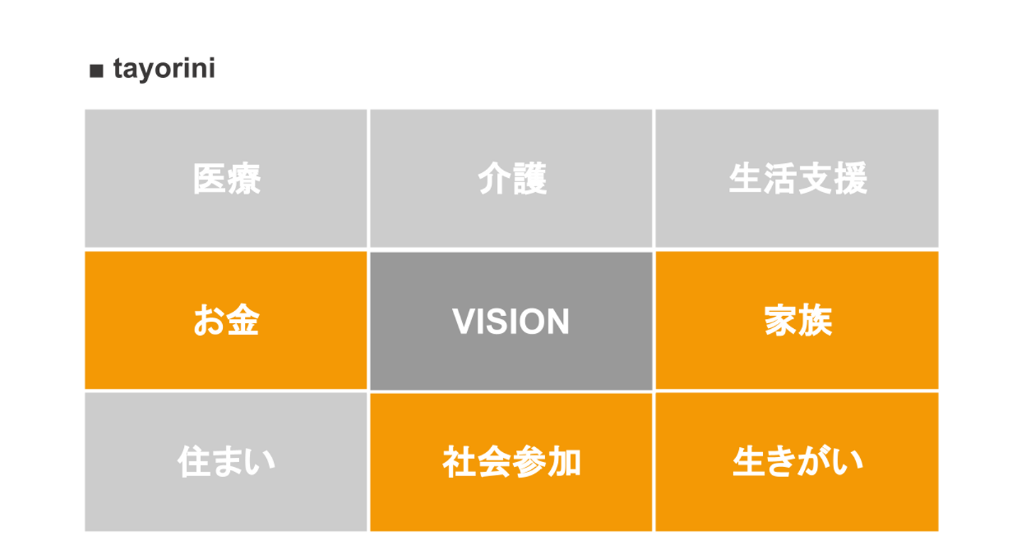 これは、上記の図の中の「お金」「家族」「社会参加」「生きがい」領域の課題に価値提供しているサービスと言える。