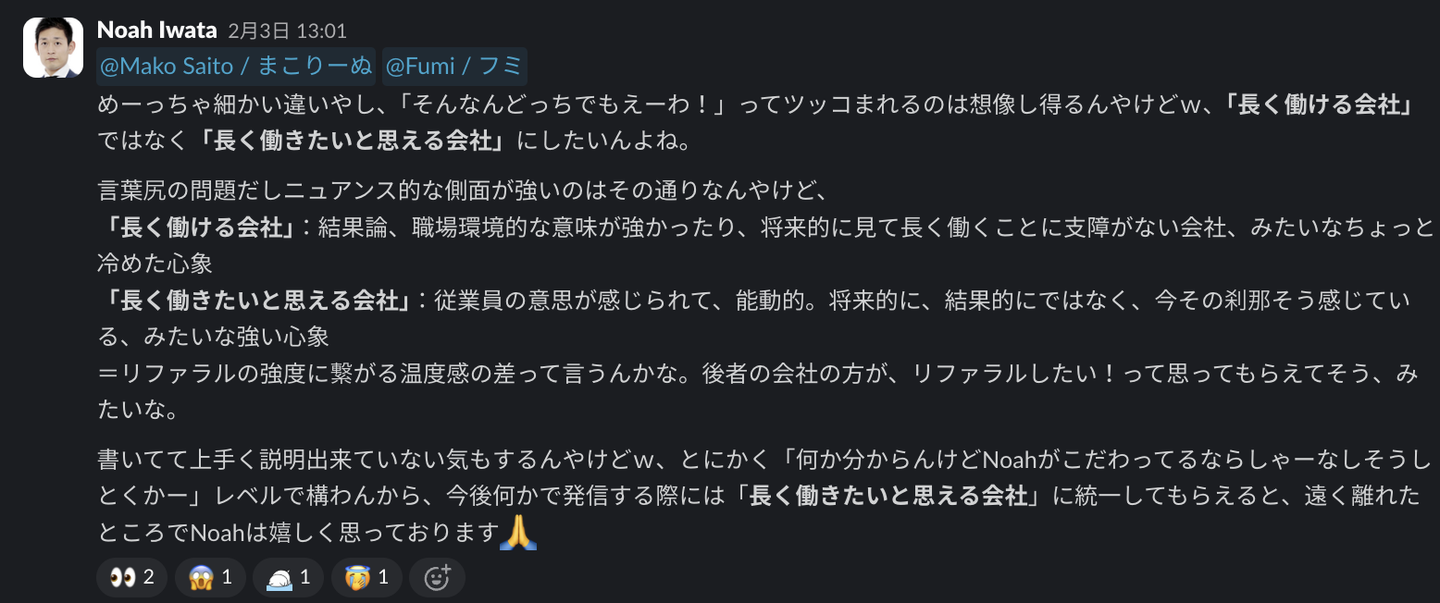Noahさん:「働きやすい」「長く働ける」は受動的な感じがします。結果的に今居心地がいいから長く働くことに支障がない、という引き目の感じが。一方「長く働きたい」というのは、メンバーが能動的に、ここでずっと働きたい、ここで成果を出したいという強さが感じられる言葉です。”can”と”want to/love to”の違いですね。