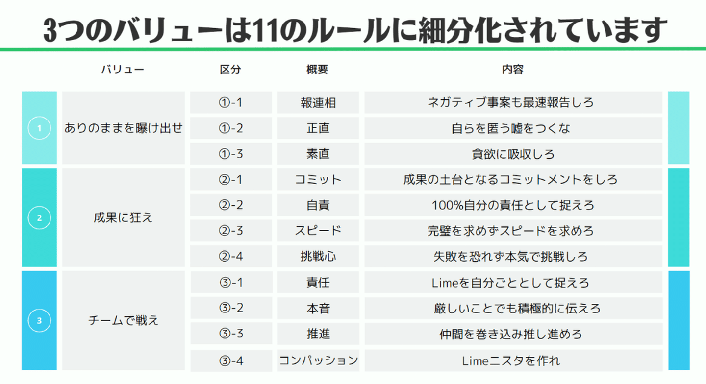 「Limeバリュー」とは、会社の行動指針をまとめたもので、以下の11項目が該当します。