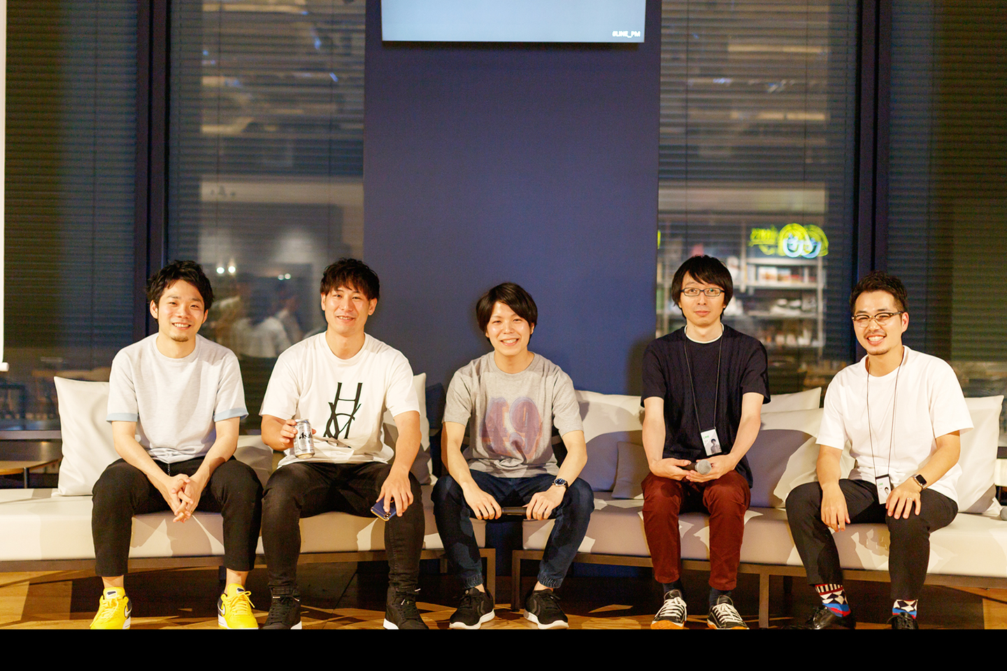 左から、金融系サービスの立ち上げに携わる川崎、「LINEギフト」の米田、「LINE Ads Platform」を担当する須藤、「LINEマンガ」の平井、「LINE公式アカウント」全般を担当する執行役員の二木。就業後なのでお酒も少し入ってます。