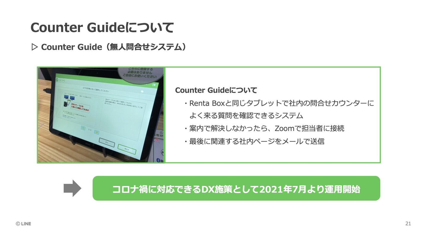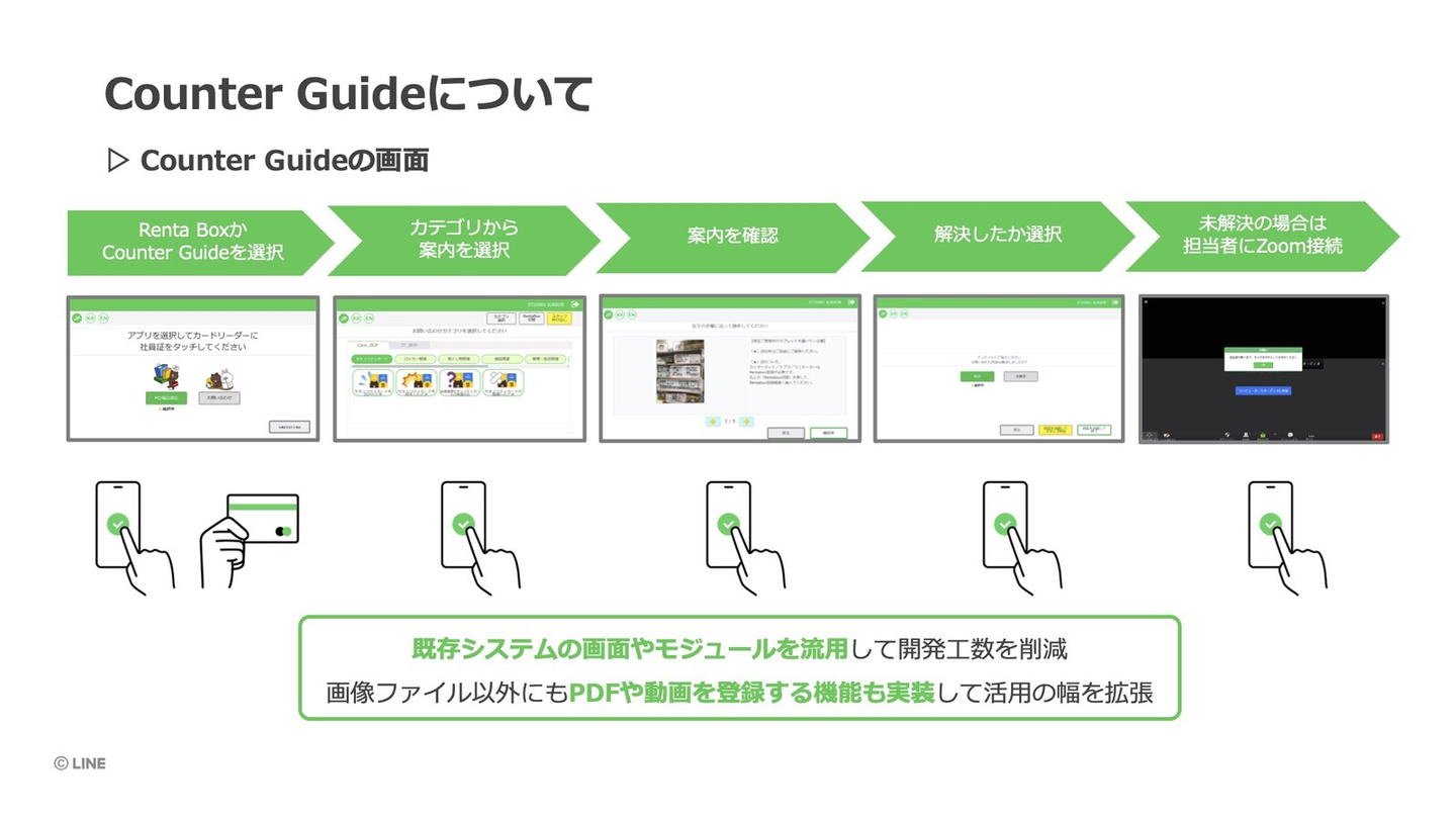 ①Renta BoxかCounter Guideのどちらを使うか選択 ②カードリーダーに社員証をかざす ③問合せをしたいカテゴリや項目を選択 ④問合せに対する回答が表示される。もし、問題が解決しない場合は、タブレット上で担当スタッフにZoomを繋ぎ、直接会話が可能 ⑤メールに問合せの回答コンテンツを送る機能があるので、自席に戻っても改めて回答内容を確認できる