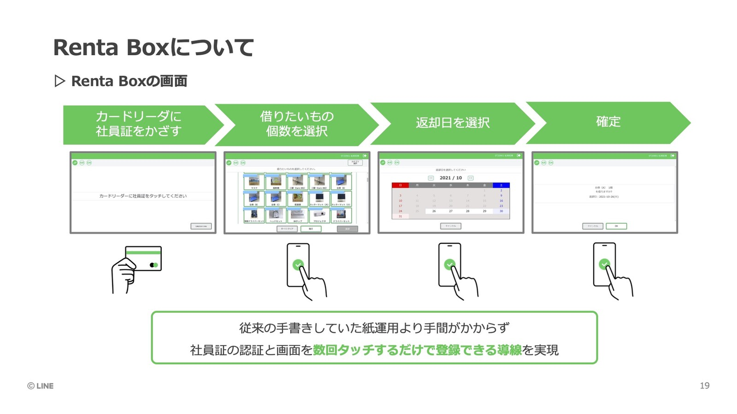 ①カードリーダーに社員証をかざし、個人を識別 ②画面に表示される備品画像一覧から、必要な備品を選択 ③返却日を選択 ④確定。備品貸出手続き完了