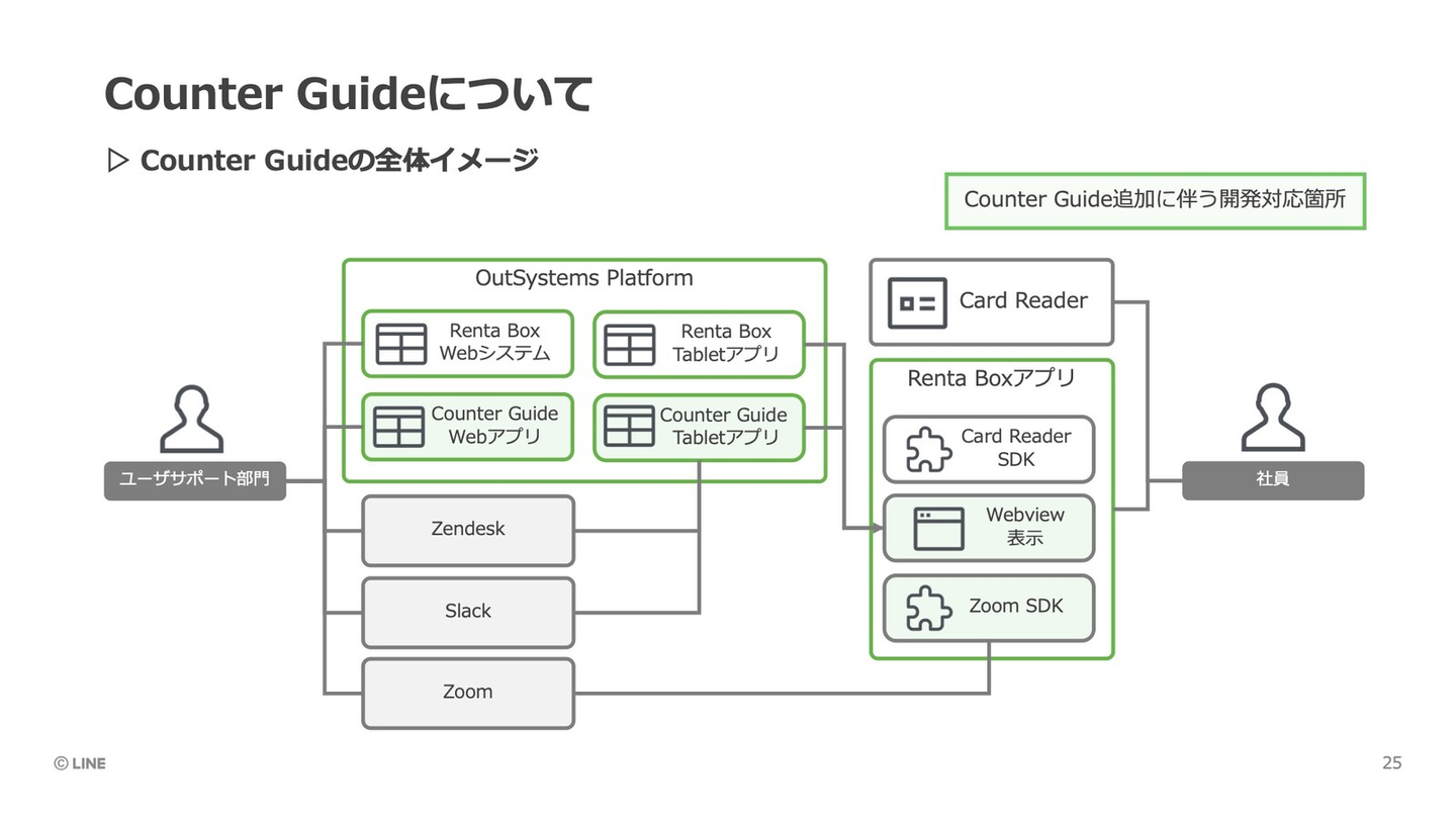 OutSystemsで開発したアプリにZoomのSDKを埋め込み、Zoom画面をWebviewで表示するように設計しています。 ユーザー視点では、RentaBoxとCounter GuideのUIは近い形で設計しているため、慣れた操作感で使えますし、言語選択機能を実装しているので外国籍社員にも使いやすいです。 OutSystemsの特長によって、これらのアプリのスピード開発を実現できたと考えています。 Renta Boxは2019年4月〜2021年7月末までで7,100回以上の備品貸出の対応業務が削減、Counter Guideはカウンター常駐スタッフの問合わせ対応履歴の記録作業の削減と在宅勤務を可能にし、ユーザーの利便性向上だけでなく、バックオフィスの働き方改革にもつながっています。 ローコードツールを触ったことが無いけれど、『OutSystems』を使って社内の改善に取り組んでみたいという方の参考になれば幸いです。