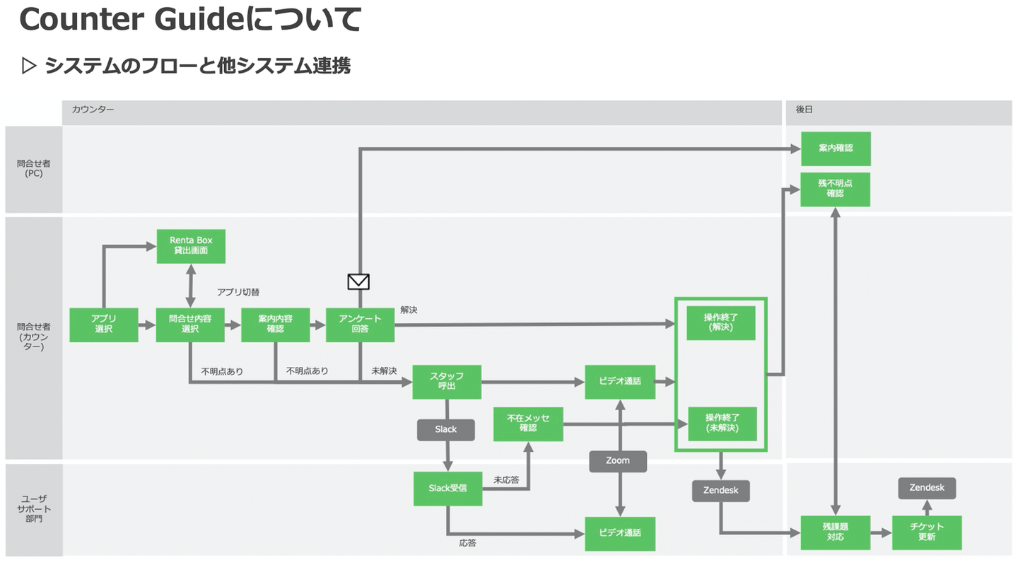 Counter Guideに表示された回答コンテンツを読んでも課題が解決されなかった時に、Zoomでスタッフに質問ができます。 『スタッフ呼出』を選択すると、Slackで担当スタッフに通知が届き、問合せをした社員とZoomで接続する処理がはいります。 また、対応完了後に回答コンテンツを社員にメール配信する機能や、Zendeskで問合わせ内容を記録(チケット化)する機能を盛り込んでいます。