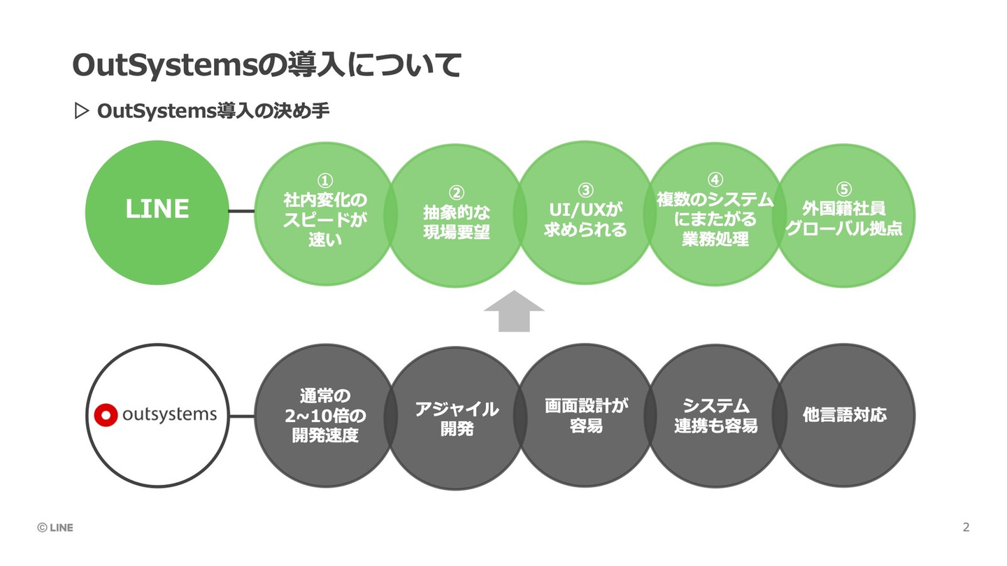 OutSystemsの導入背景 LINEグループの業務改善アプリを開発する上で、セキュリティの点や、外国籍社員が多く多言語対応が必要である点、事業変化のスピードが速いためスピード開発が求められる点など、様々なハードルがありました。『OutSystems』はこれらの開発にあたっての必須要件を満たしているため、導入にいたりました。