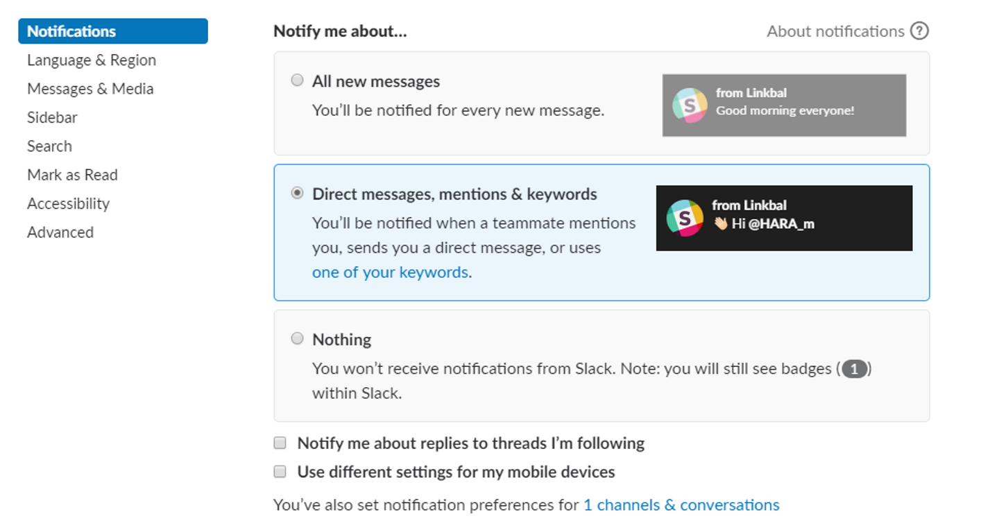 2.「Notifications」で、デフォルトはALL new messagesにチェックが入っているはずなので、Direct messages,mentions & keywords に切り替え。(以下画像参照)