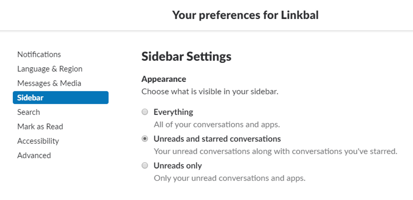 3.左側にあるタブの「Sidebar」をクリックし、デフォルトの「Everything」から、「Unreads and starred conversations」に切り替え。(以下画像参照)