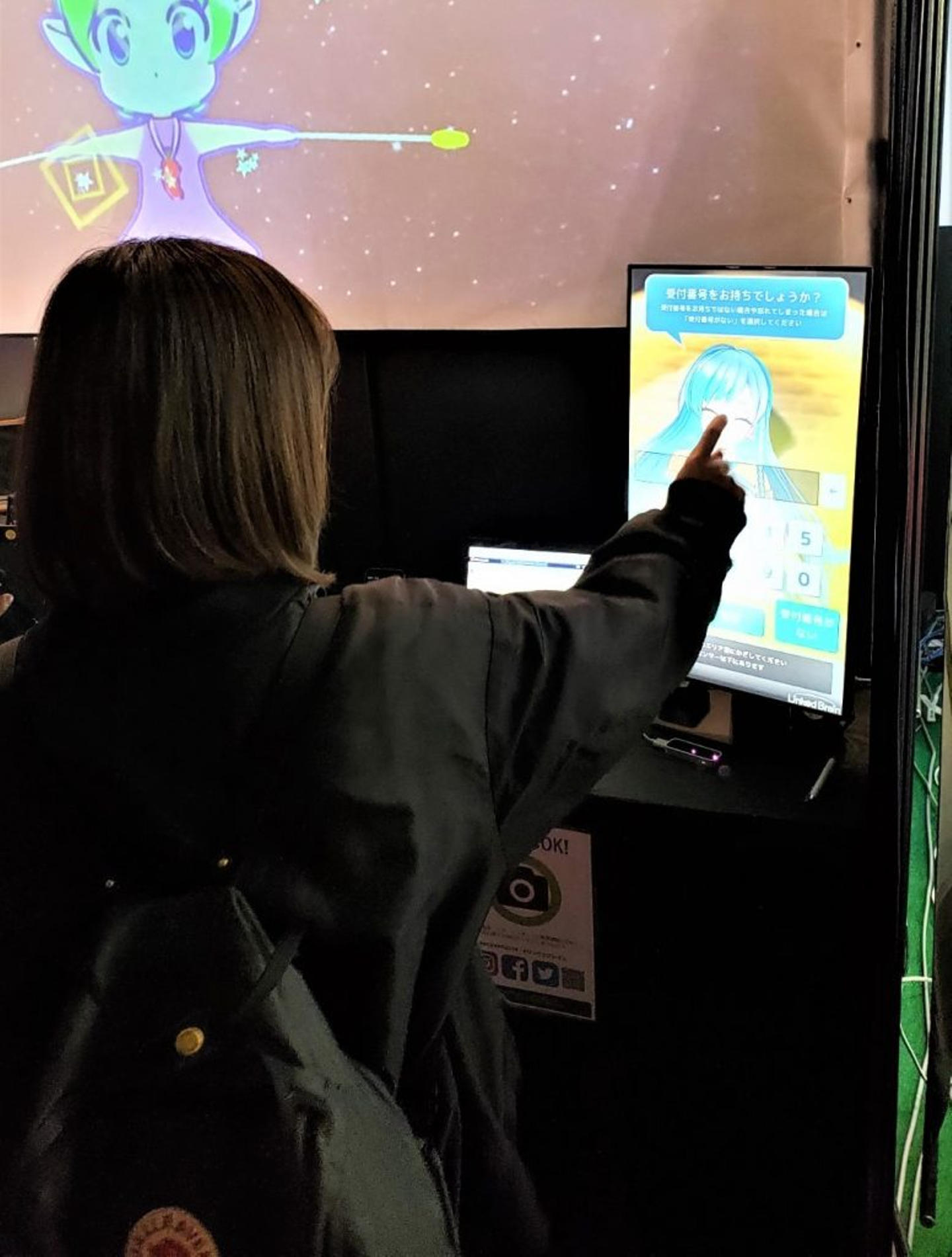 画面に直接タッチするのではなく、Leap Motion(リープモーション)を使い、手のジェスチャーによって受付操作ができます。実際にお客さまに体験してもらい「タッチパネルを操作できないシチュエーションで役立ちそう」「自社の受付に取り入れたい!」といったお言葉を多くいただきました。