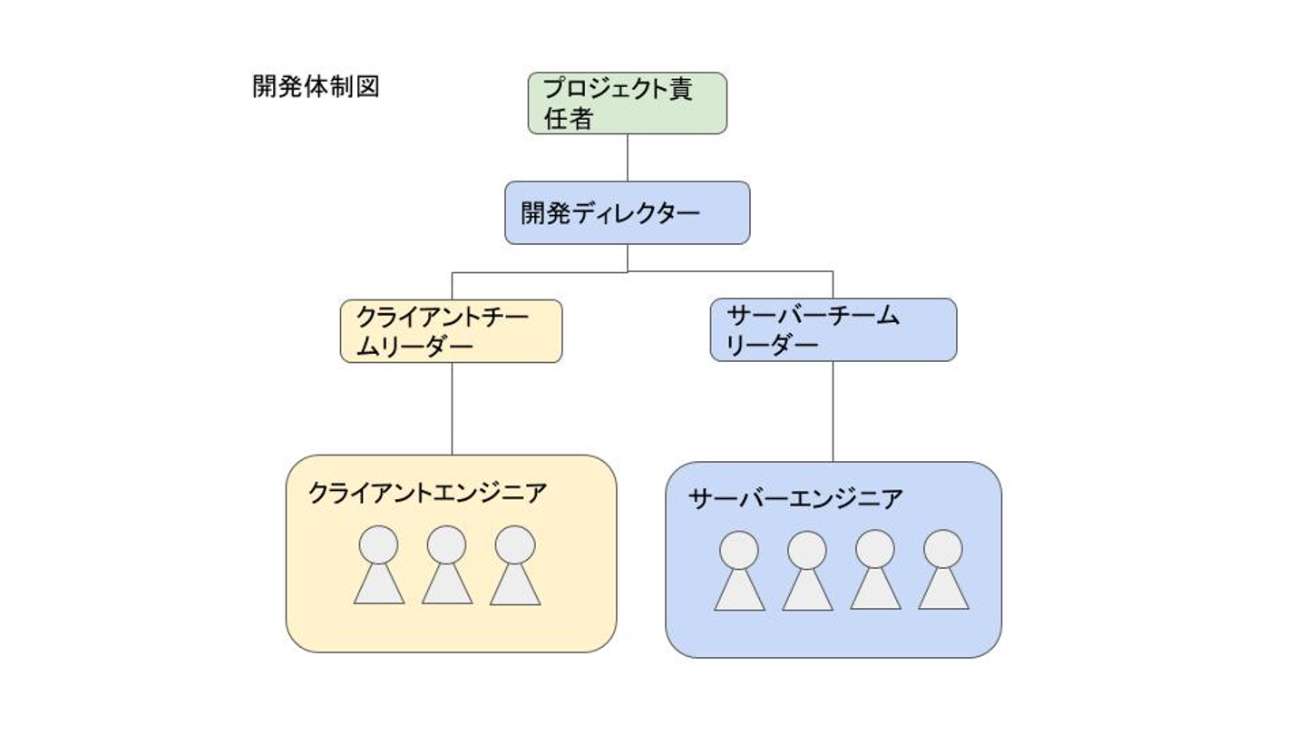 チーム体制はプロジェクト責任者をトップに据え、開発責任者である開発ディレクターが我々エンジニアチームを指揮しています。