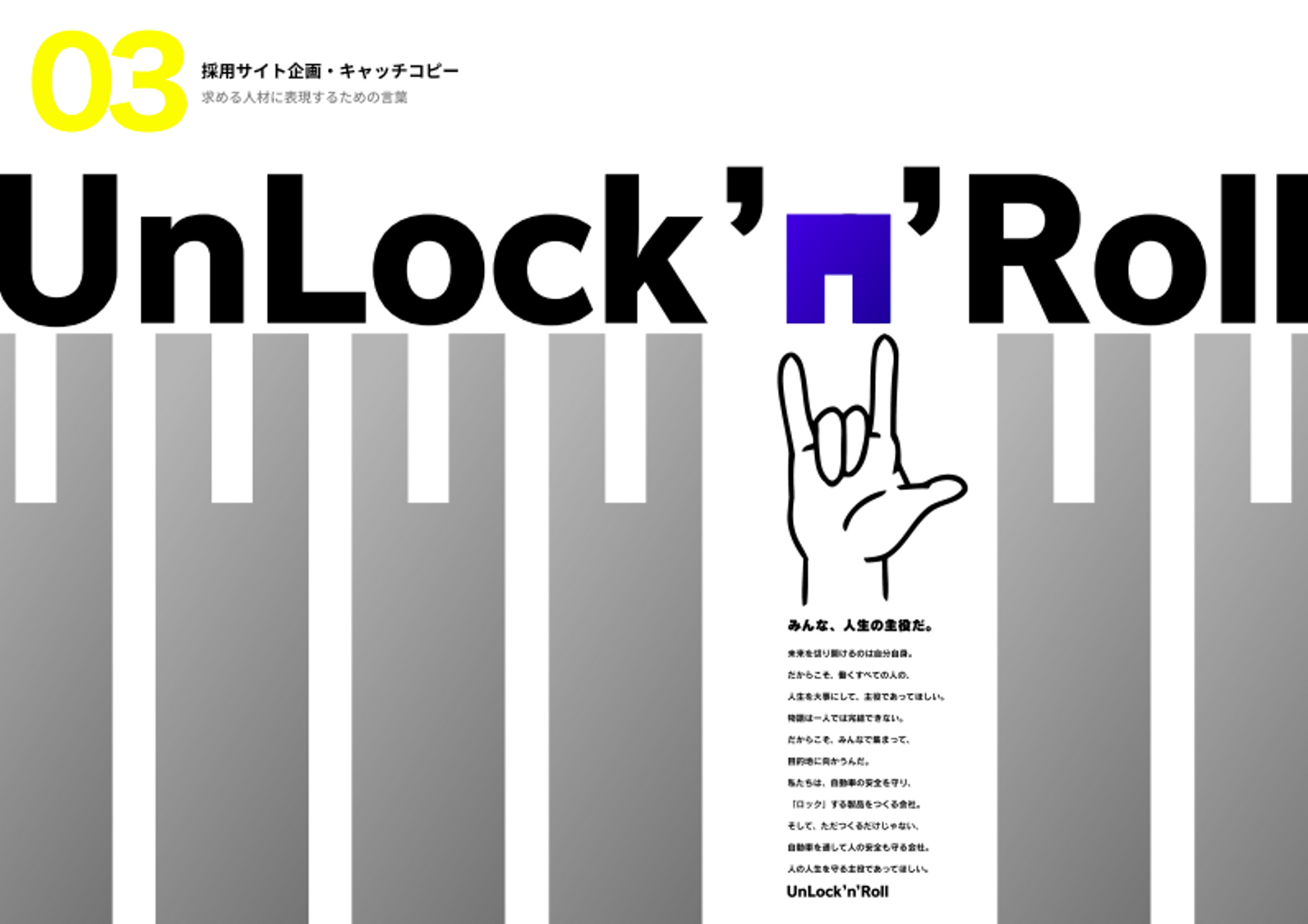 提案したのは「アンロックンロール」というキャッチコピーのもと、ロックのハンドサインをモチーフにした採用サイト。「ここから道を開けて行こう!」という意味を込めました。実はこのハンドサインの形は、お客様の作る「ハンドルロック」の形とも似ているんです。ハンドサイン以外の案も含め3案提案しましたが、ライオンハート内でも一押しだったこの案が採用されました。