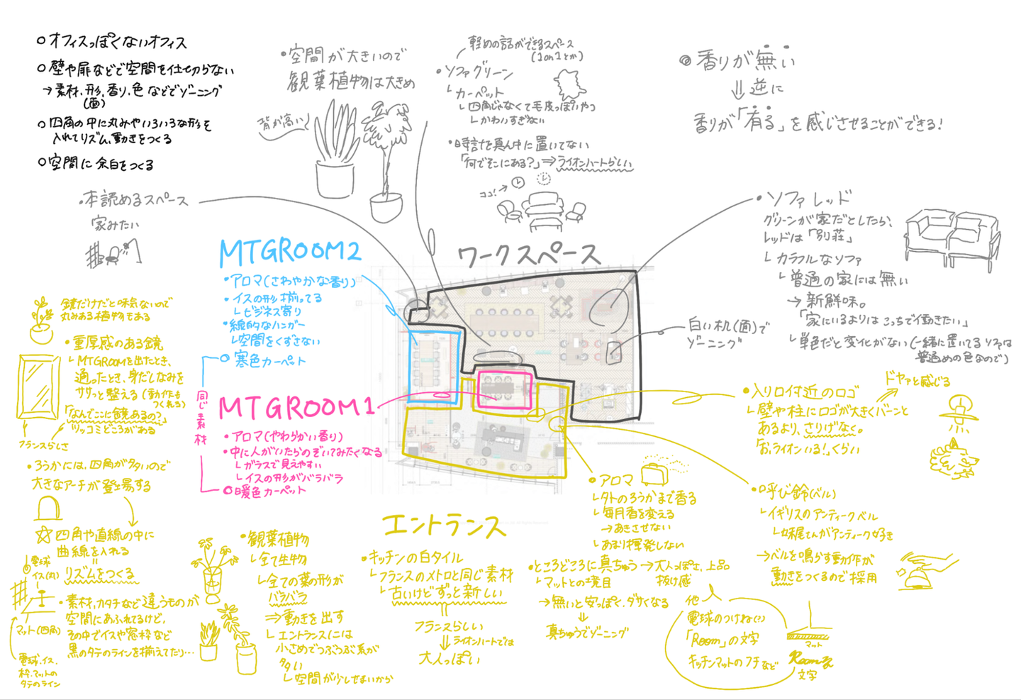 インテリアや観葉植物などについても同じです。なぜそれがあるか、なぜその形状でなければいけないのか。どんな内装にするのか。その設定背景に、僕たちは明確な説明を求めます。通常のオフィスが有するあらゆる機能について、それぞれがどんな役割を担い、目的を達成しなければならないか、きちんと設定するのがまず最初の一歩。それが定まらない限り、どんな姿形になるかは議論できないじゃないですか。