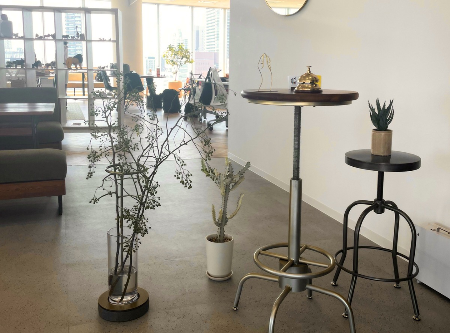 オフィスに入ってすぐ右にあるテーブルにベルを設置。奥にはメンバーのワークスペースが広がっているため、お客様がお見えになるとすぐに気付けるようになっている。
