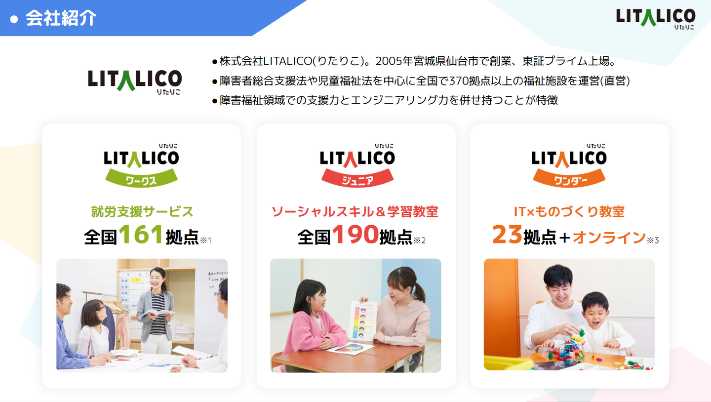 2005年に創業したLITALICOは、障害のある方の仕事探しを支援する「LITALICOワークス(https://works.litalico.jp/)」から始まりました。その支援を通じて、「もっと早い段階からの支援があれば、活躍できる仕事の選択肢がさらに広がったはず」という課題認識から、障害があるお子さま向けのソーシャルスキルの獲得を支援する「LITALICOジュニア(https://junior.litalico.jp/)」が生まれます。