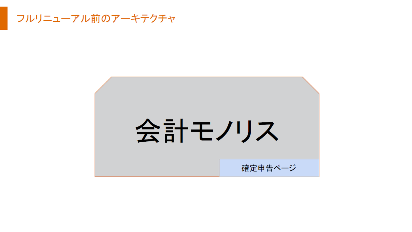 もともと確定申告機能は会計プロダクトの一機能だったものを、リニューアル後では分離されて疎結合になりました。フロントとバックエンドもSPA(Single Page Application)のような感じで分岐しています。