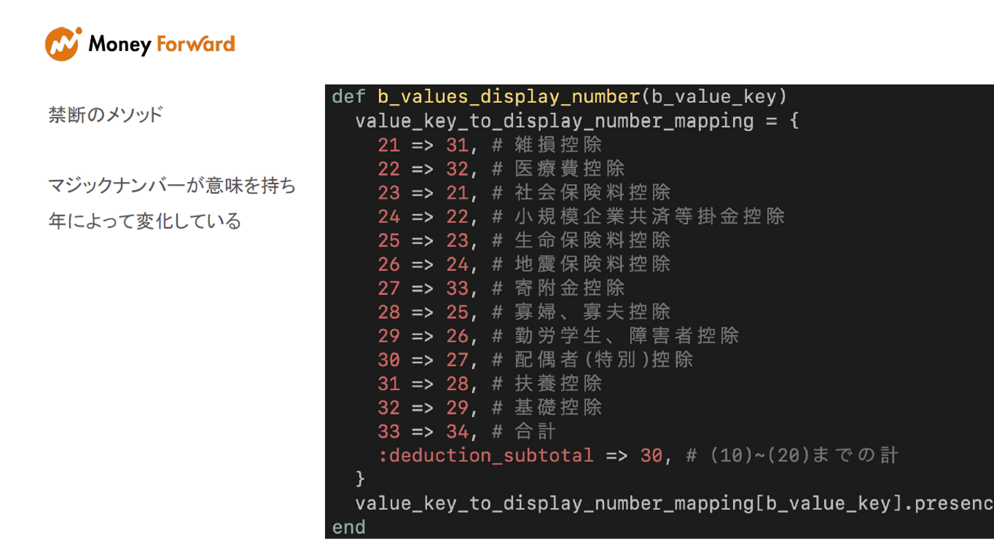 また、確定申告の年次によって仕様が異なる計算を、たった1つのロジックで管理していました。確定申告って毎年計算や仕様が異なるものなんですが、年次が違ってもロジックが単一、となると分岐が大量に発生して構造がスパゲッティ化していたんですね。