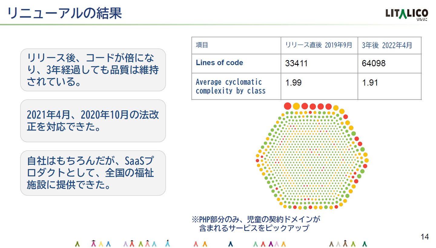 さっきの図では赤い丸が非常に大きかったですが、リニューアル直後は平均的な状態ですね。2年経った後ではコードは倍になっていますが、複雑度は変わらず運用できています。品質維持できているという状態を実現できました。