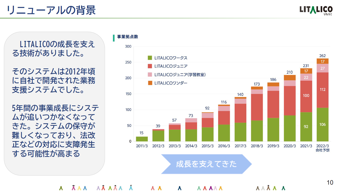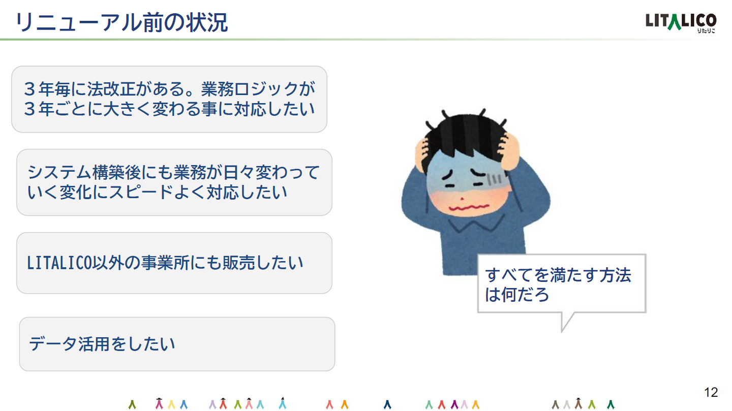 今回のリニューアル対象は、2012年からのLITALICOの急激な成長を下支えしてきた自社内のシステムでした。数年の間で保守がどんどん厳しくなっていく中で、定期/不定期の法改正にも対応する必要がありリスクのある状態でした。