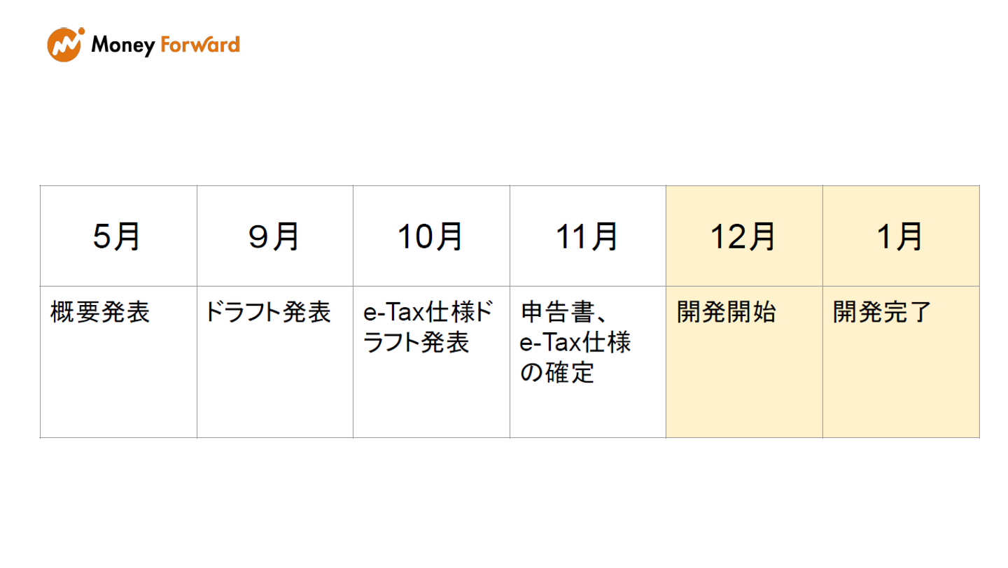 毎年の開発サイクルとしては、大体5月に次年度の確定申告に関する概要が発表され、e-Taxの仕様が確定するのが11月。つまり、全体で1年かかるプロジェクトなのに、開発用の期間は12月から1月の2ヵ月間しかないという…超短納期での開発が求められるという特徴があります。