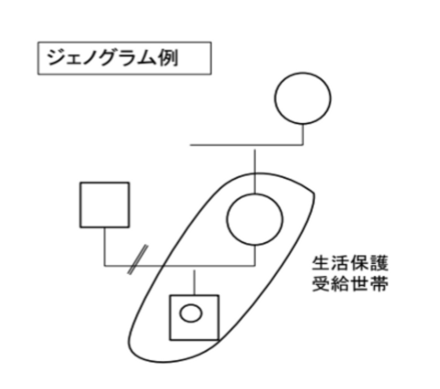 (緒方)援助者が利用者を中心とした家族関係を理解するために作成される図です。こちらのジェノグラム例からは、お子さま(男の子)とお母さんがシングルマザー世帯として一緒に暮らしていること、お父さんとは離婚しているという状況を読み取ることができます。