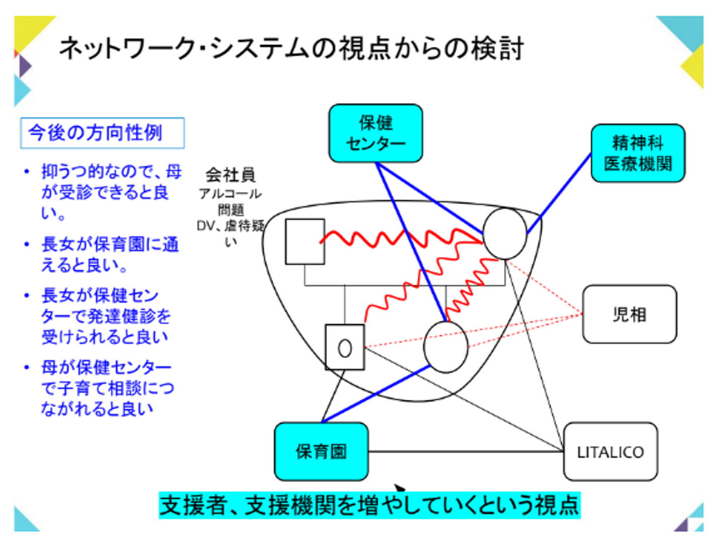 関係性を整理した上で、ここのシステムが上手く回っていないから、ネットワークを形成してより上手くケースが回るようにしていこうという発想をします。
