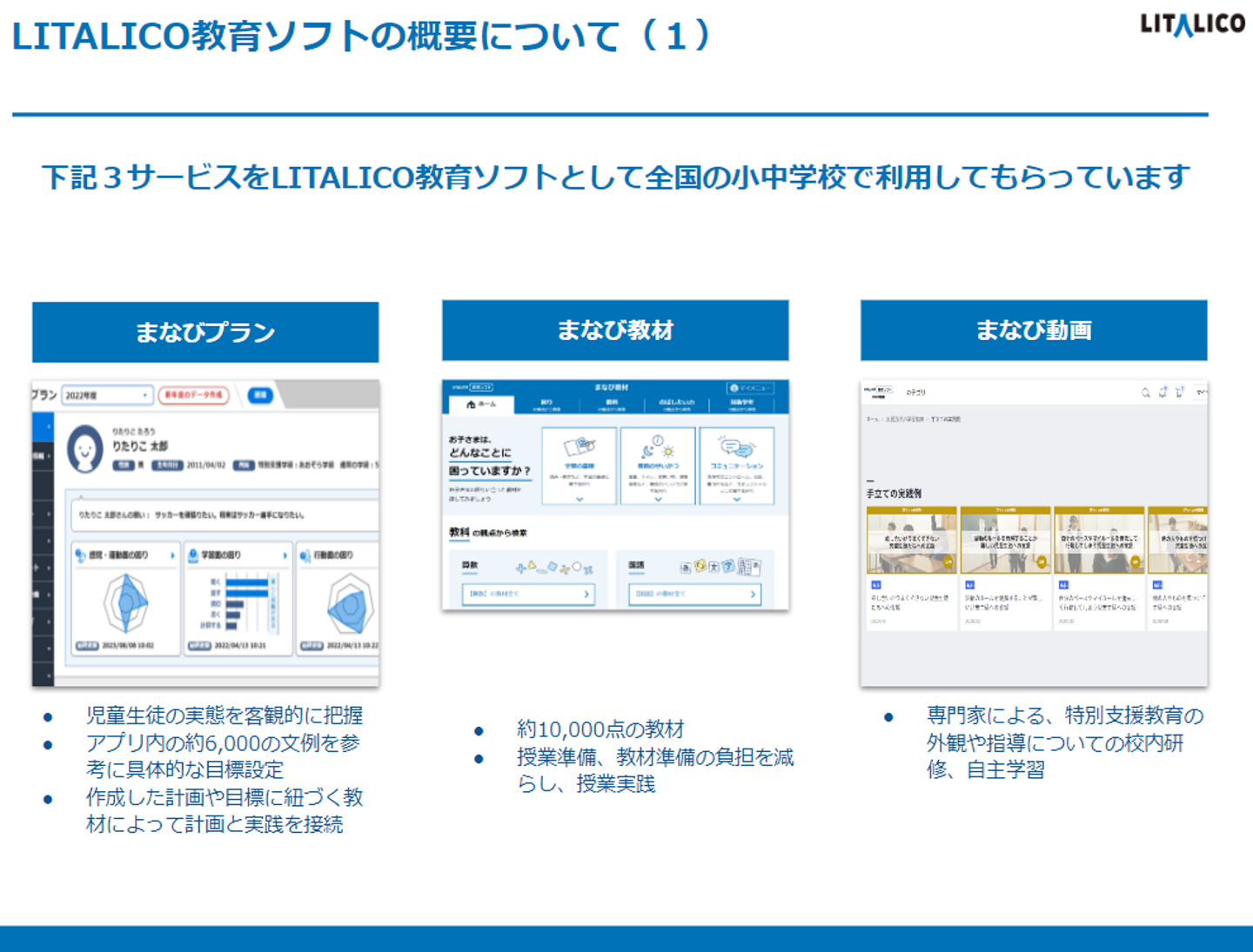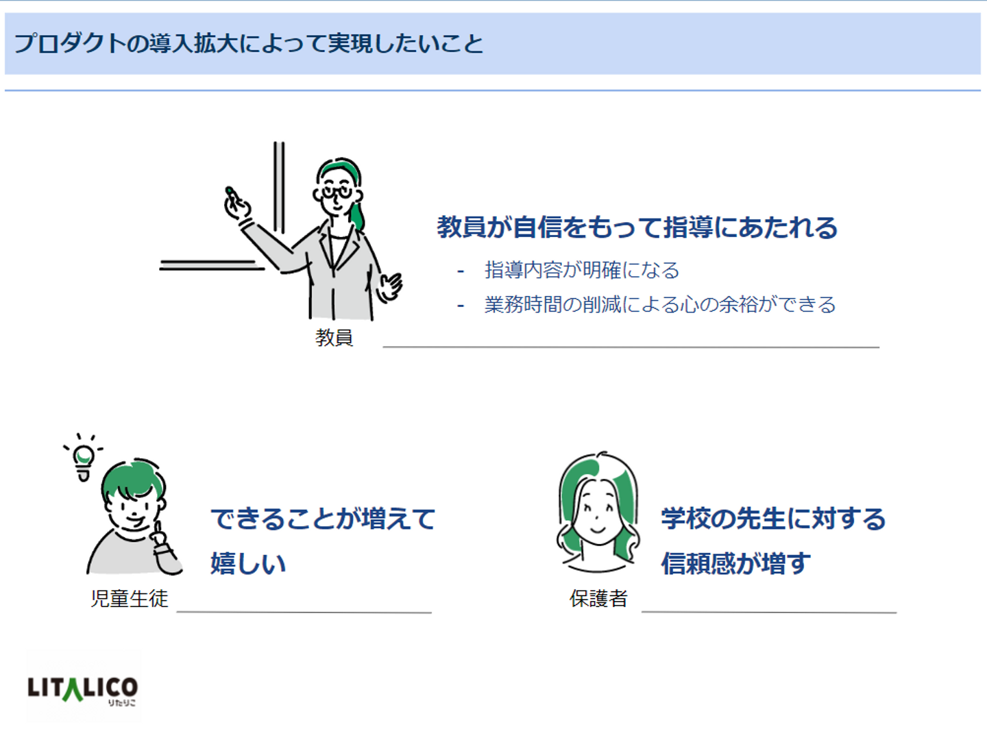 本事業では、大きく2つに課題を絞っており、特別支援教育の分野で障害などの専門知識がないまま生徒を受け持つ教員が増えていること、学校教育全体で教員の業務負荷がそもそも増加しており、一人ひとりに向き合う時間が減少していることに着目しています。それに対し、教員が生徒の教育支援計画をたてるためのサポートツールや、教材・動画の提供によって全国の小中学校の特別支援領域の関係者へ提供を推進しています。