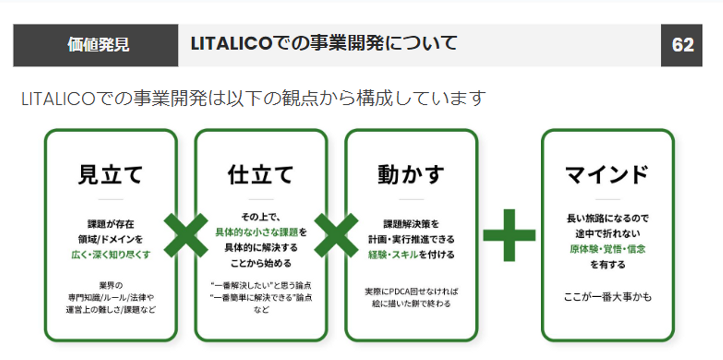 Day1の冒頭では、LITALICOがどのように新しい事業を生み出しているのか、大切にしている観点やフレームワークについて解説しました。例えば、LITALICOではソリューションを生み出す前の段階で下記の課題発見プロセスを大切にしています。
