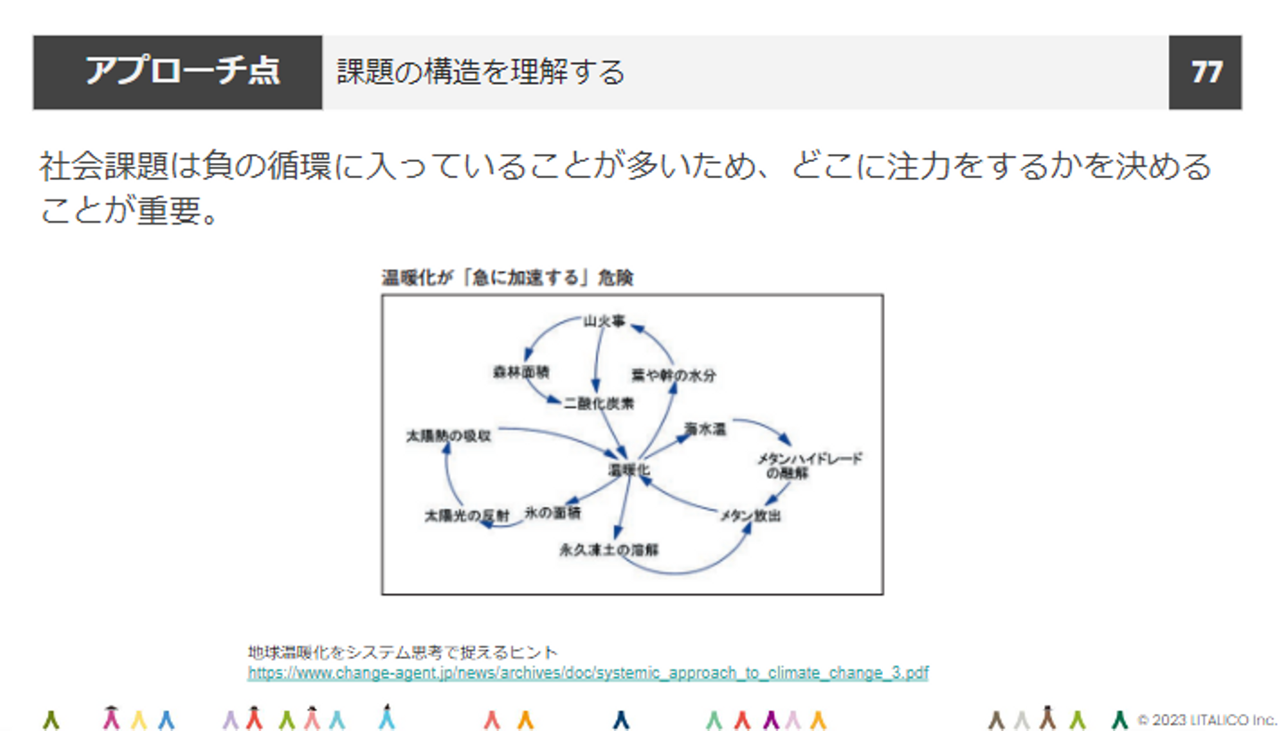 その他、特に社会課題の解決にあたってはユーザや法律など様々な視点での事前調査が重要であることや、社会課題においては「負の循環」に陥ってしまっているケースも多いため、課題がループしあうなかでどの特定課題に着目するのかを考えることの重要性も参加学生へ伝えました。