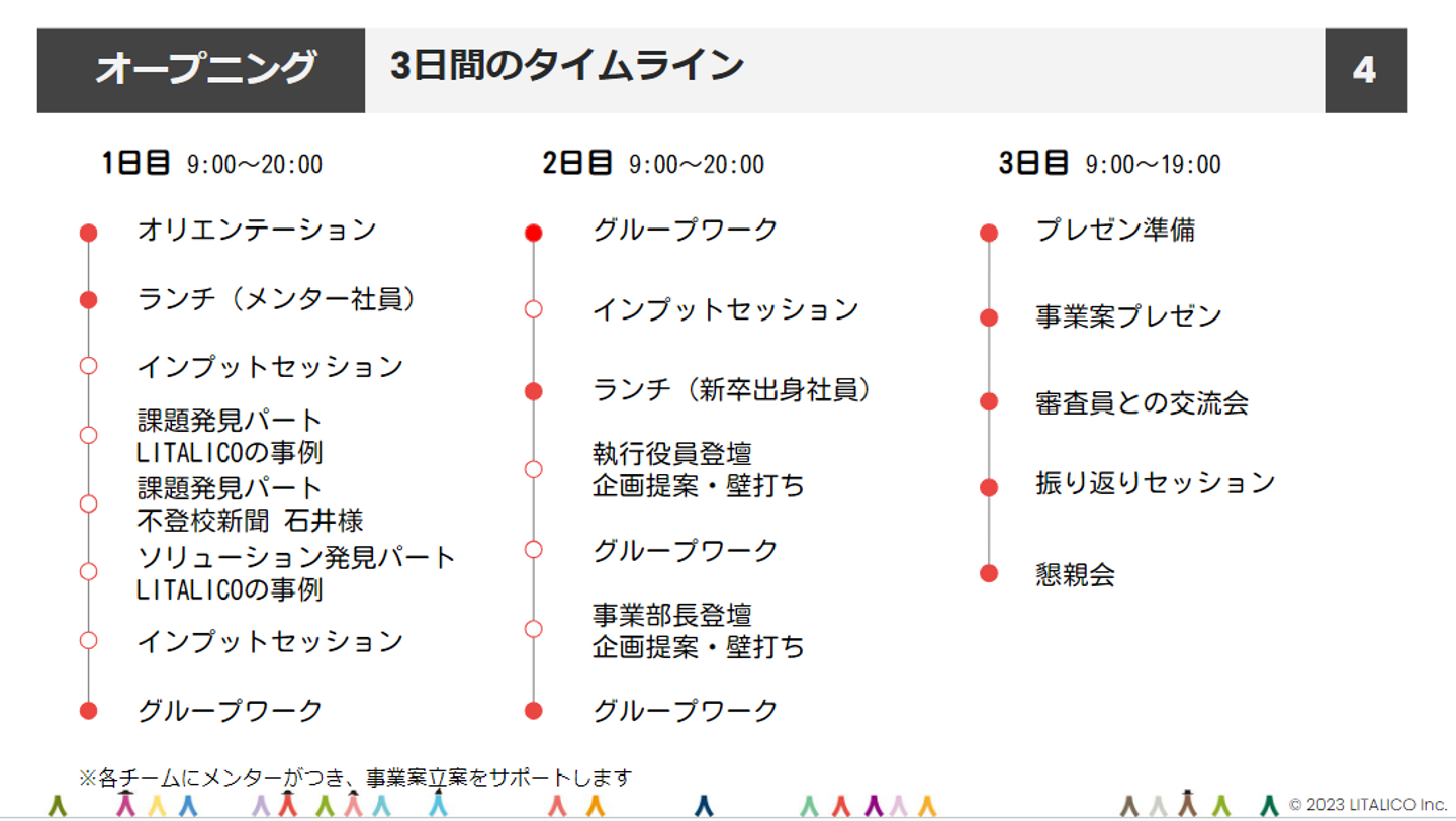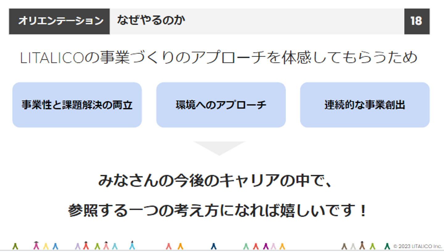 2023年8月・9月に実施されたLITALICOの新卒ビジネス総合職向けインターンシップ。3日間×2テーマにわたって開催されたこの企画では、会社や事業情報のインプット、学生側からのアウトプットともに盛りだくさんで設計されています。今回は「働く」と「学ぶ」の2つのテーマにて実施されました。