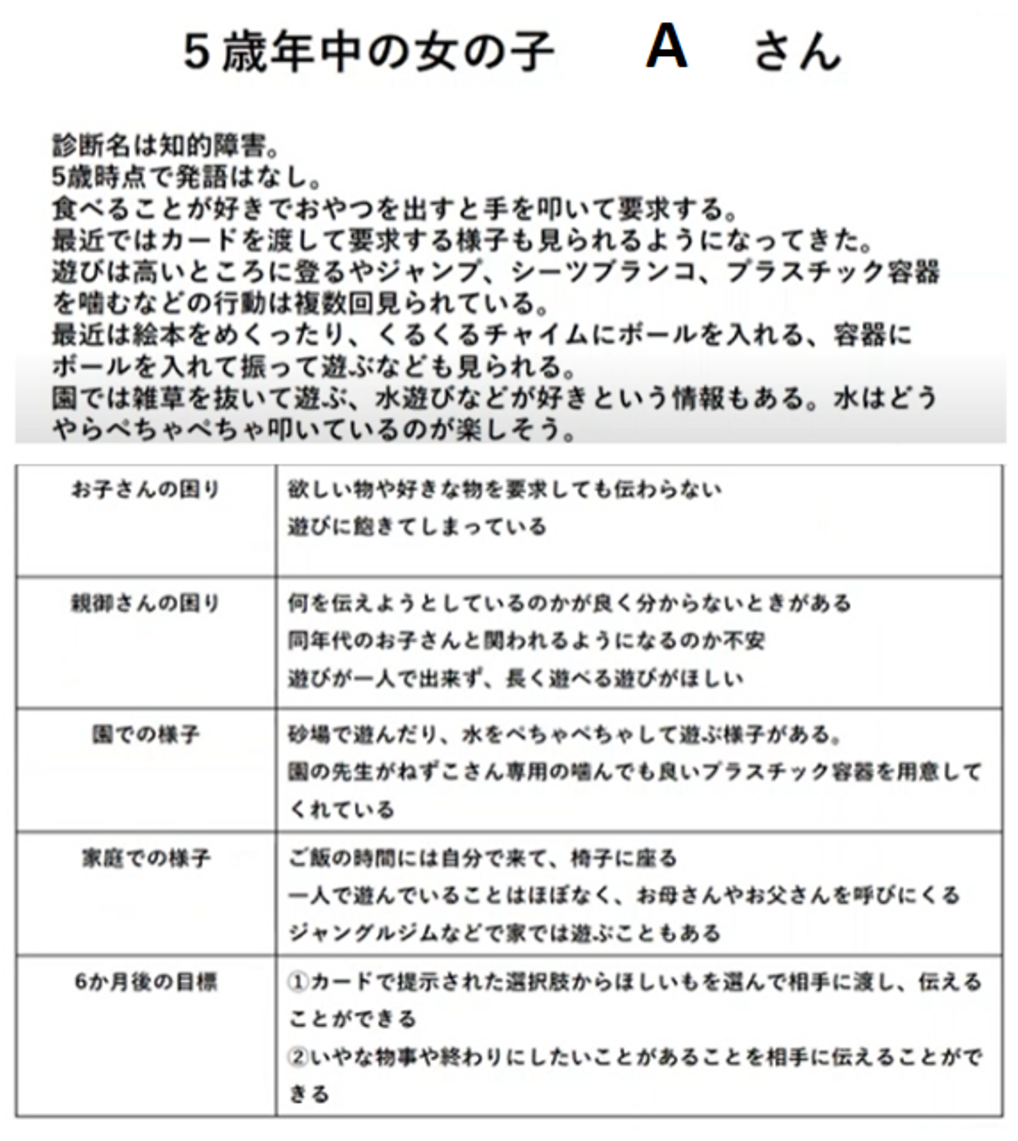 また、保護者さまから「お子さまが一人で遊べない」というお話も記載がありました。お子さま個人だけではなく、周囲の環境、つまりご家族の困りにも着目することも大切と考えてみるのも大切かなと。一人遊びの中でもAちゃんが好きな「感覚」がなにかを考えて、より一人遊びの時間が延ばせる手法や遊びにフォーカスしてもよいかもしれません。