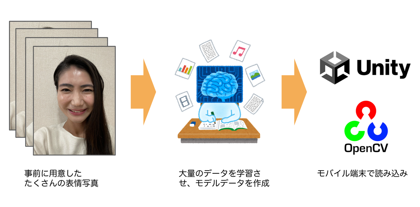 今回このアプリを実装する上でも、たくさんの表情をデータを元に表情を判別できるようなモデルを作成し、それをモバイル上で動作させることで実現しています。