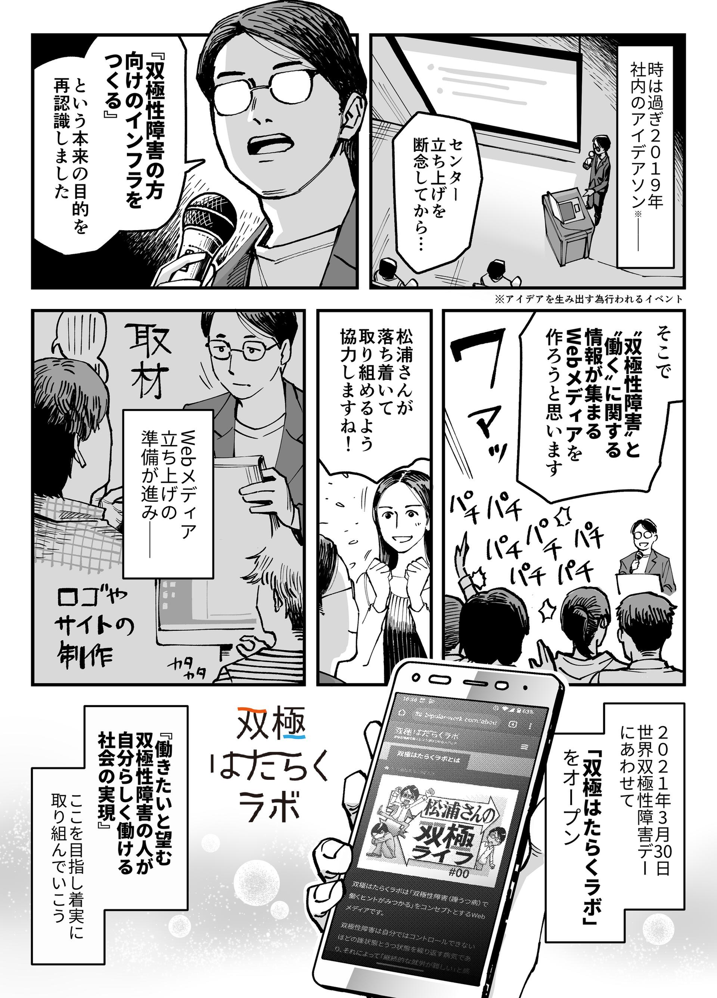 11話となる今回は、2021年3月30日にオープンしたWebメディア「双極はたらくラボ」と、その立ち上げまでのドラマを描きました。運営を担うスタッフの松浦は、Webメディアにとどまらず、今まさに取り組みの幅を広げようとチャレンジを続けています。