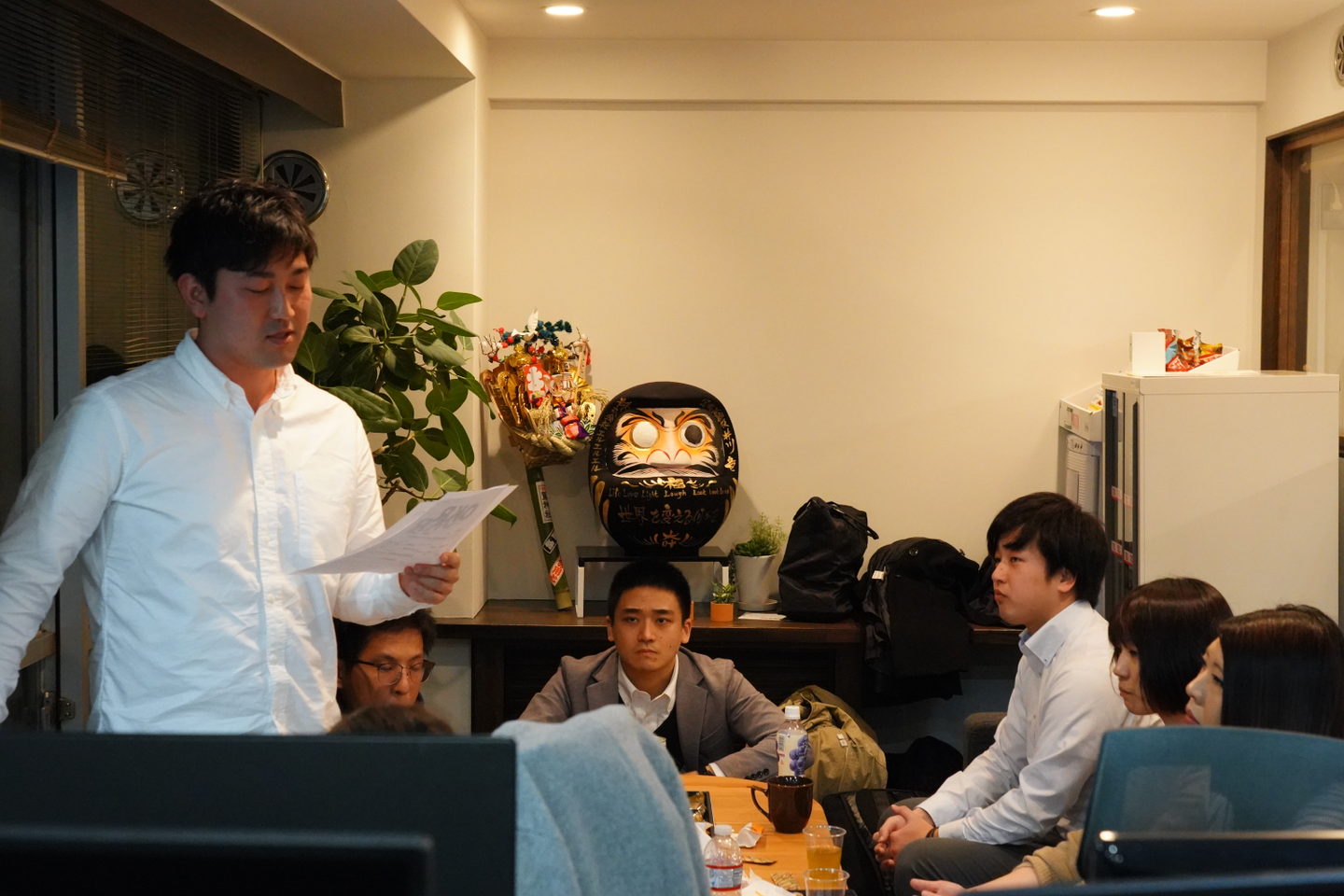 今回は、SESで働いてくれているエンジニアさんたちも参加!締め会で初めて会う方も多く、やや緊張した面持ちです。メンバーの岡田さんがイチバン緊張している様子!上のダルマさんみたいになってます。
