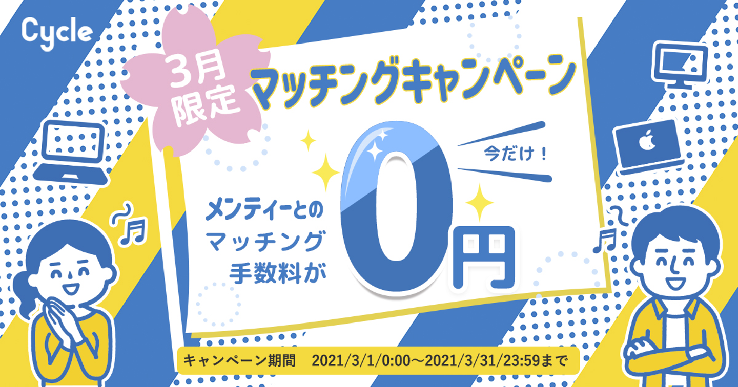 Cycleでは3月1日(月)より「3月限定!メンティーとのマッチング手数料0円キャンペーン」を開始いたします!!!