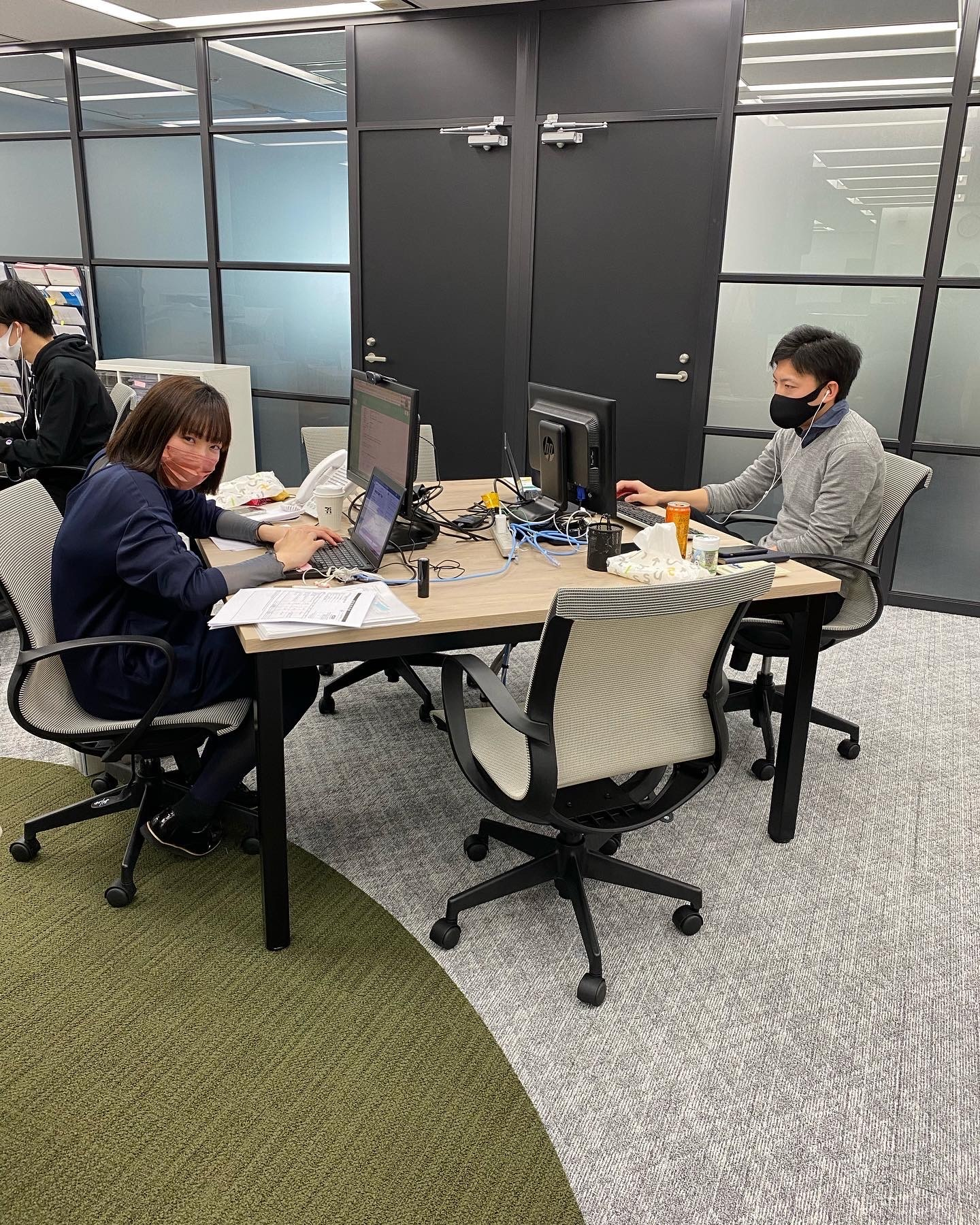 まだ一年経ってないのが不思議なくらい、もとからこうだったかのように皆さんこのスタイルに馴染んでいます。別の部署の人とも隣同士で一緒に仕事をしたり、コミュニケーションが取れる機会がとても増えたと思います!