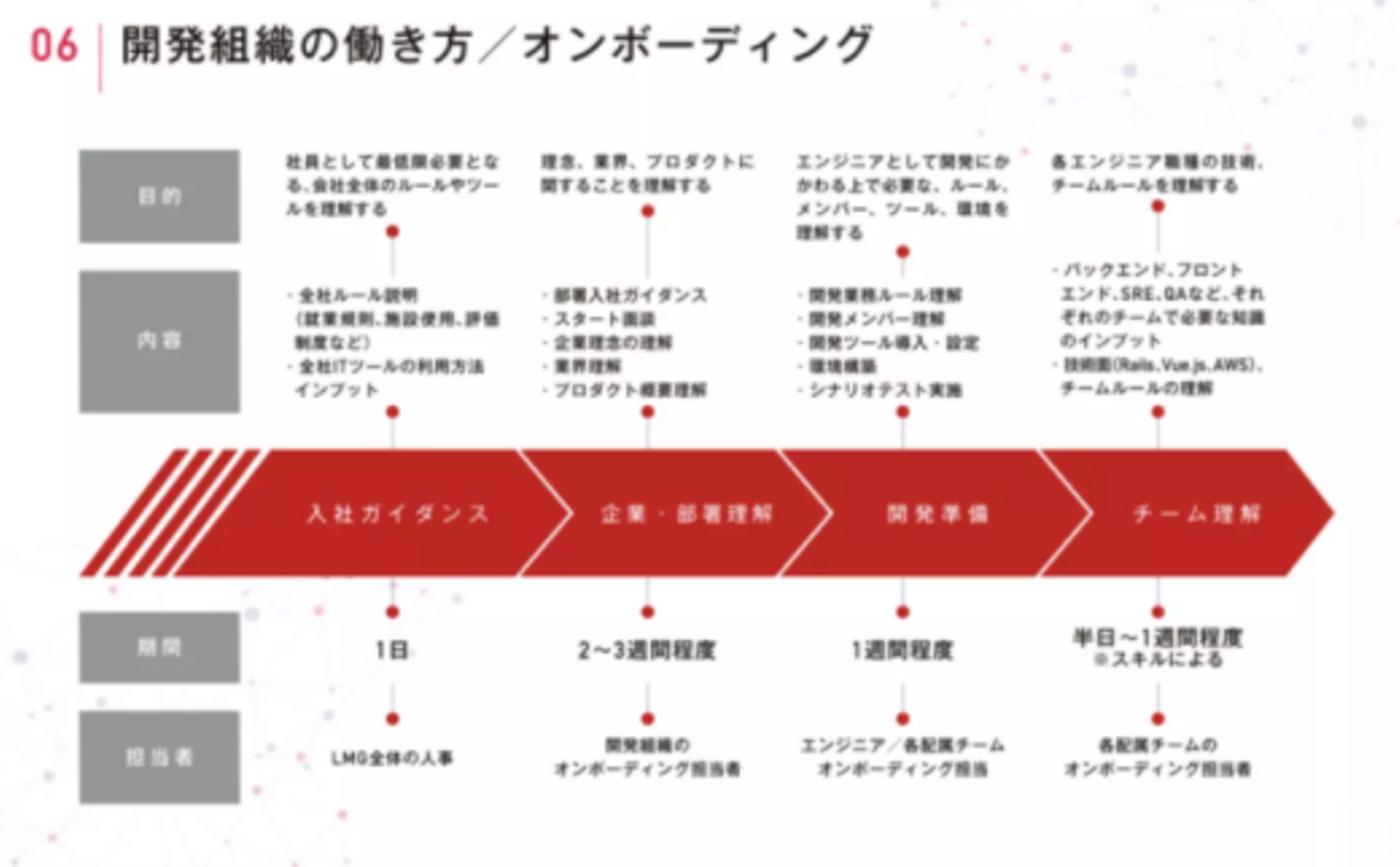 「入社ガイダンス」「企業・部署理解」「開発準備」「チーム理解」をしていただけるプログラムを用意。