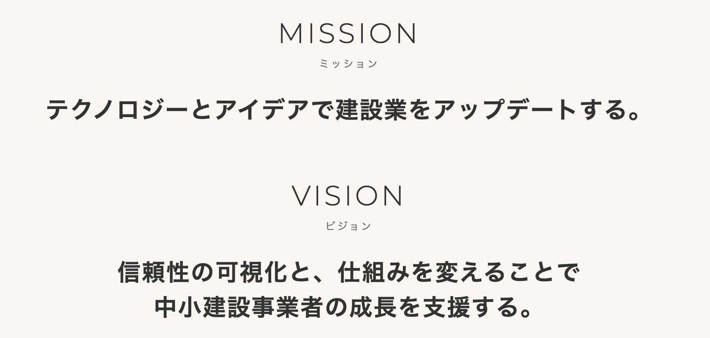 - ビジョン……信頼性の可視化と、仕組みを変えることで中小建設事業者の成長を支援する。