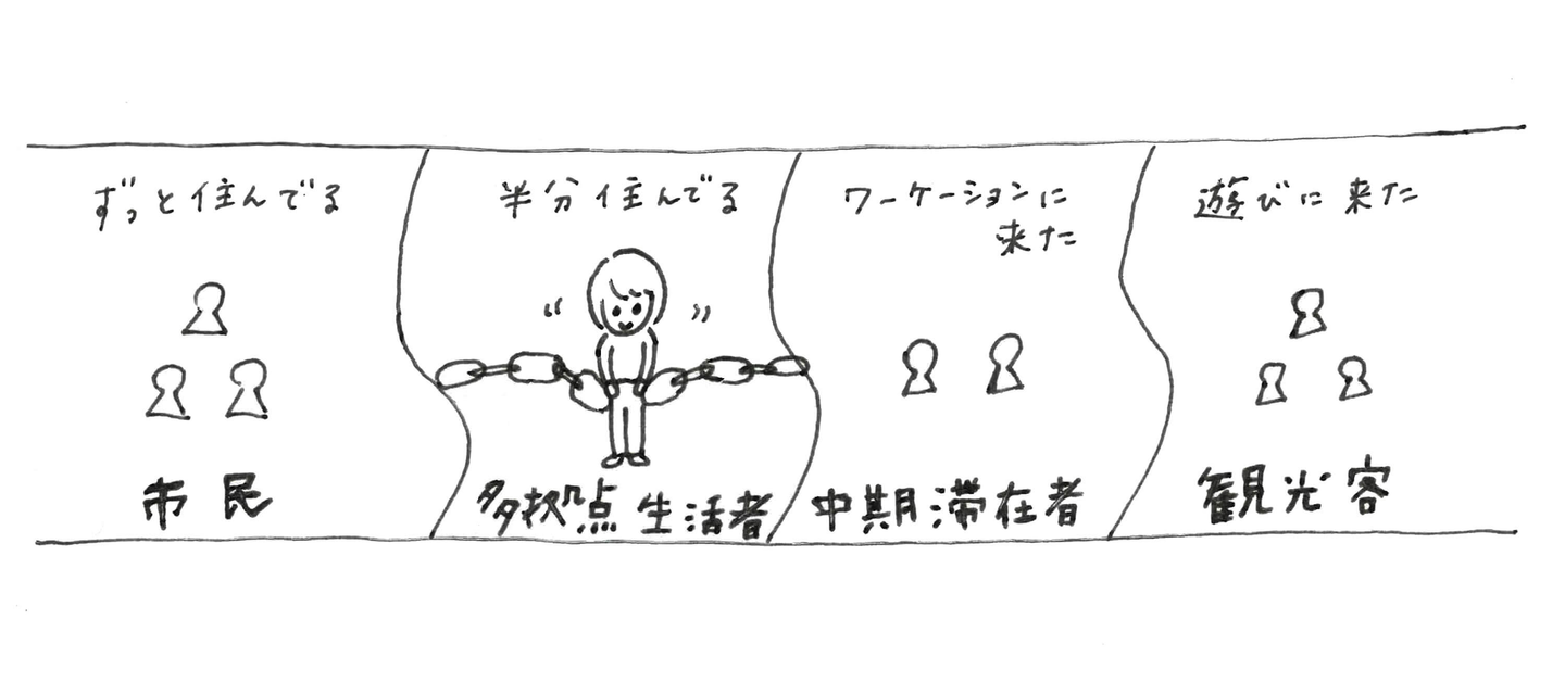 寺井 その地域のことを全く知らない人がいきなり長期滞在することで起きてしまう問題ってあるよね。薫さんみたいな地域の内と外とを行き来しながらつなぐ人の存在は大事なことだと思う。「市民 ー 半分住んでる多拠点生活者 ー ワーケーションに来た中期滞在者ー 観光客」っていうグラデーションのイメージ。