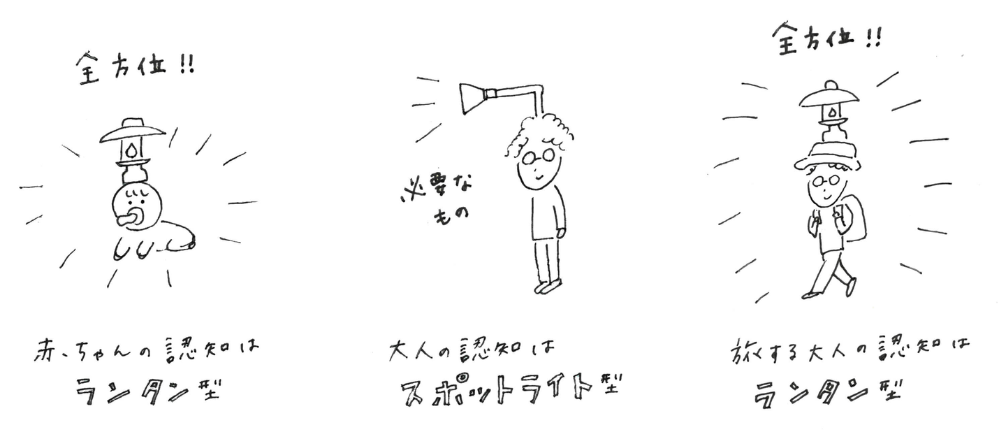 最近、『哲学する赤ちゃん』(※1)っていう本を読んだんだけど、赤ちゃんの認知の仕組みは「ランタン型」で自分の周囲360°、全方向へフラットに意識が向いちゃうんだよね。それが大人になるほど「スポットライト型」になる。つまり、大人になると自分にとって必要なもの、必要じゃないものを無意識に線引きして、「必要なもの」の世界の中だけで行動するようになるんだよね。でも、大人も「初めてのこと」をするときだけは、意識が「ランタン型」に戻るんだって。