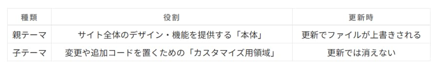 親テーマを直接編集すると、テーマ更新のたびに変更が消えるため、実務では子テーマにカスタマイズをまとめることが一般的です。