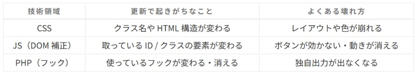 テーマやプラグインを更新したとき、影響が出やすいポイントを整理すると次の通りです。