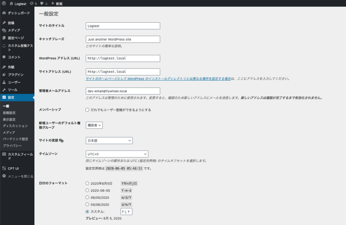 これら2つをアップロードすると、サイドバーに「カスタム投稿テスト」と「カスタムフィールド」の項目が表示されます。