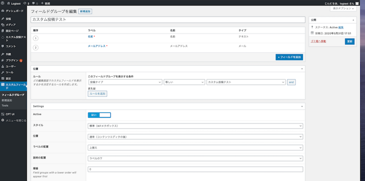 次に、これらのフィールドが「カスタム投稿テスト」を用いた記事のみに反映されるよう、「ルール」の条件分岐を切り替えましょう。