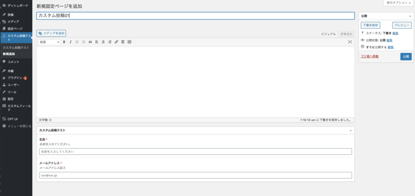先ほど設定したフィールド項目が表示されます!必要事項を記入して、公開します。